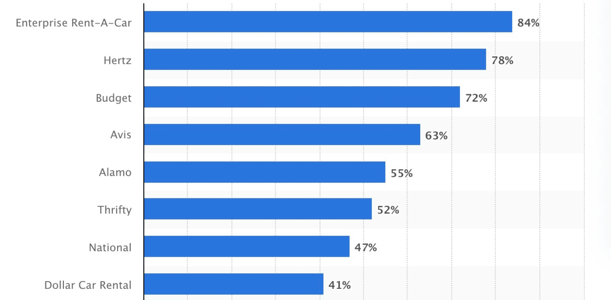 Avis ranks fourth with 63% of users. It has a strong presence in the market but has room to grow compared to leader Enterprise (84%).