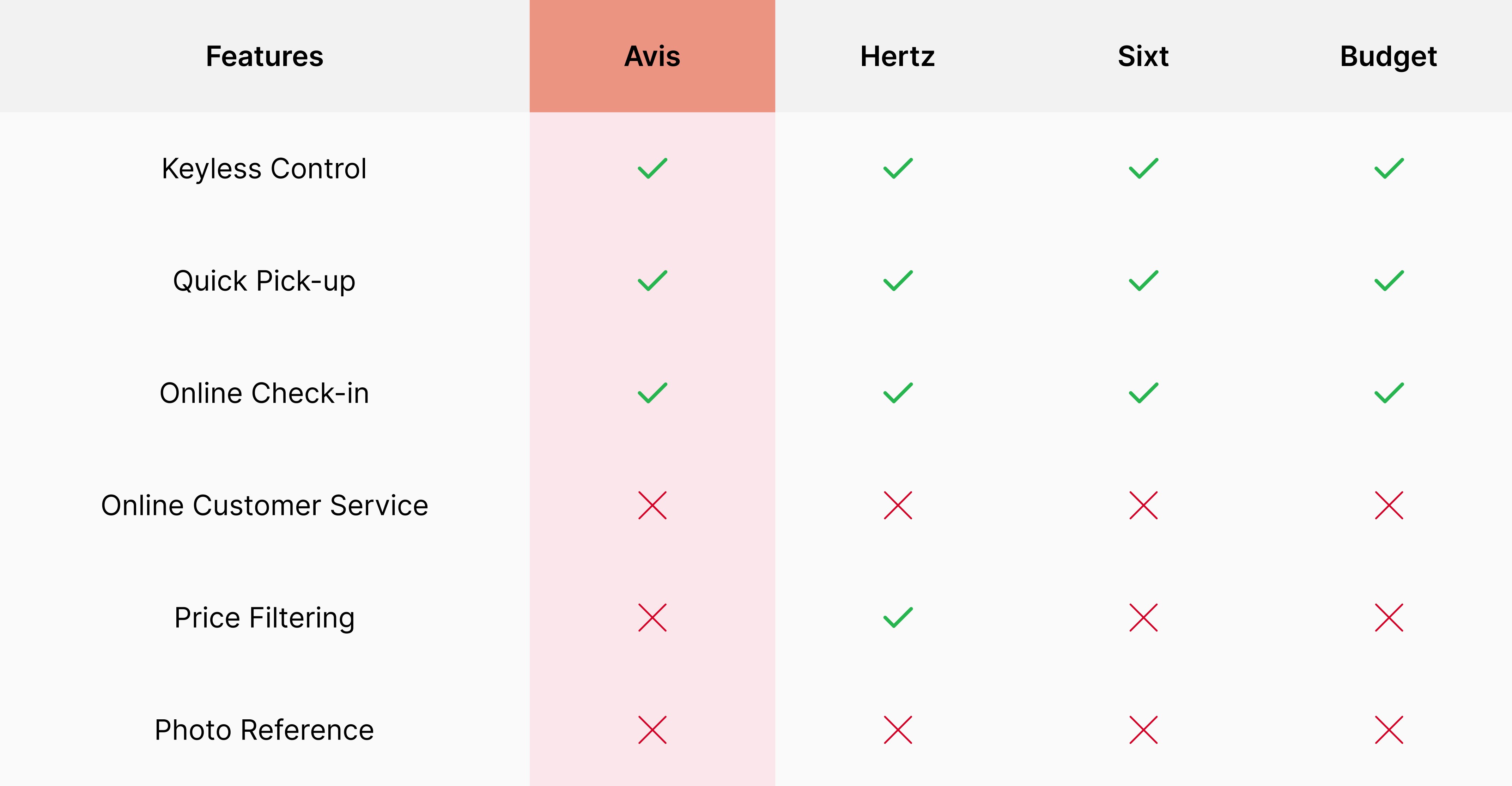 Avis charges an average of $570 per week, which is mid-range. This price point means that customers expect a premium experience, but the current experience does not meet user expectations.